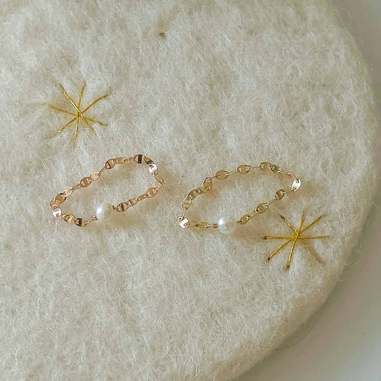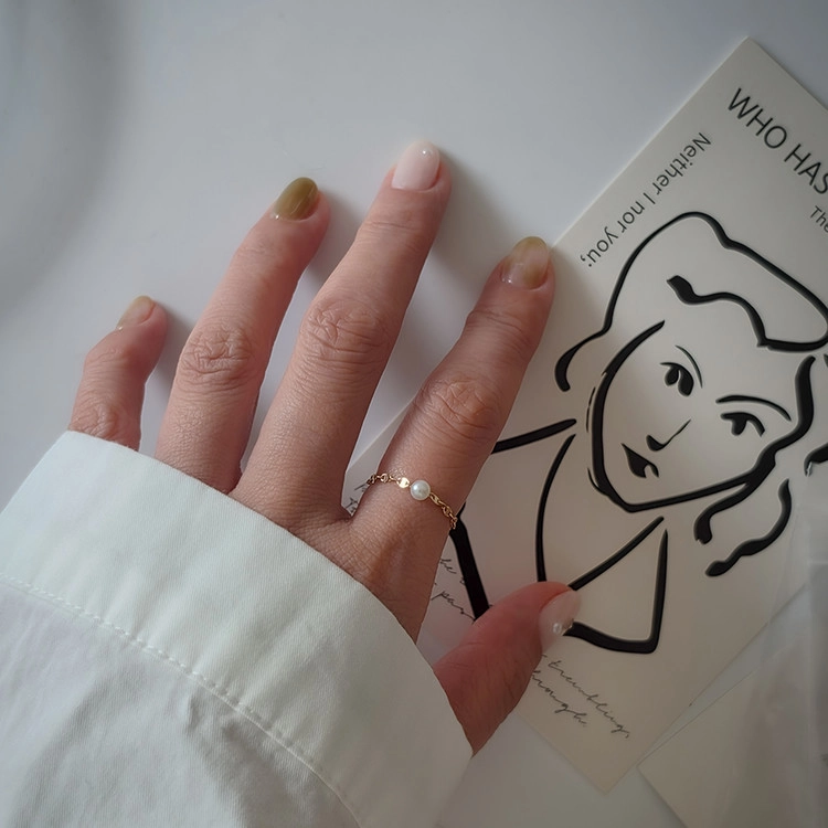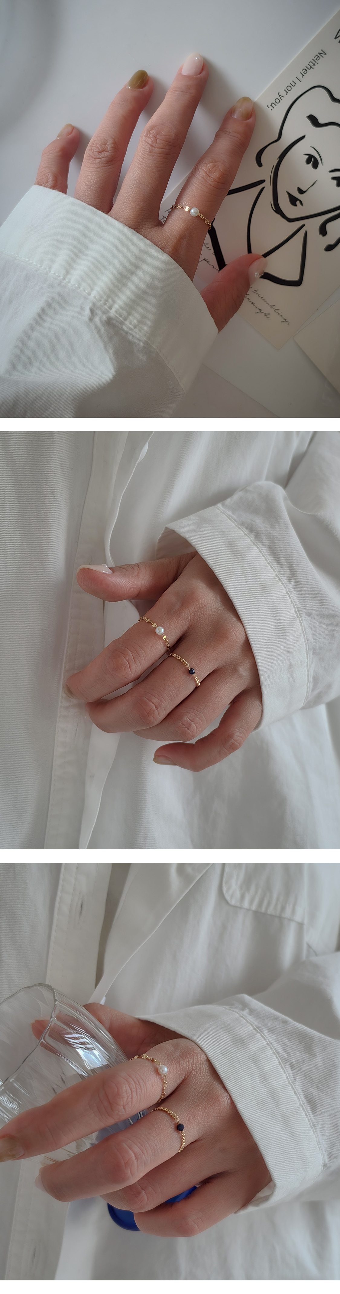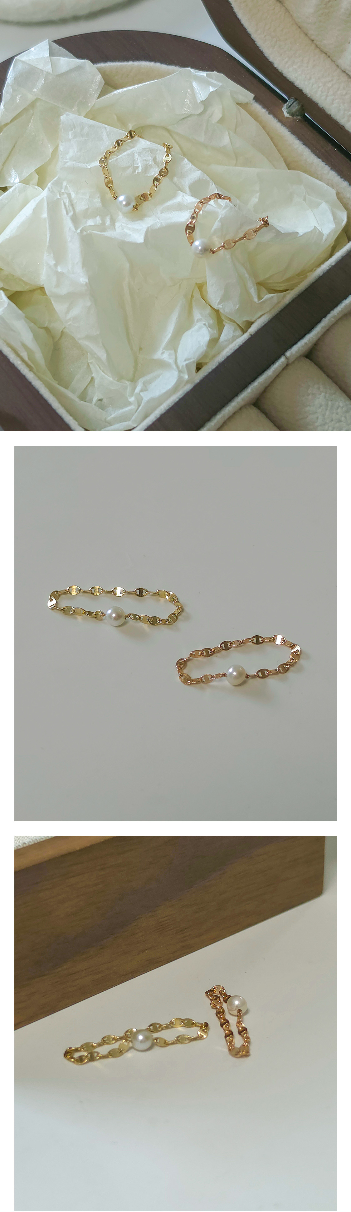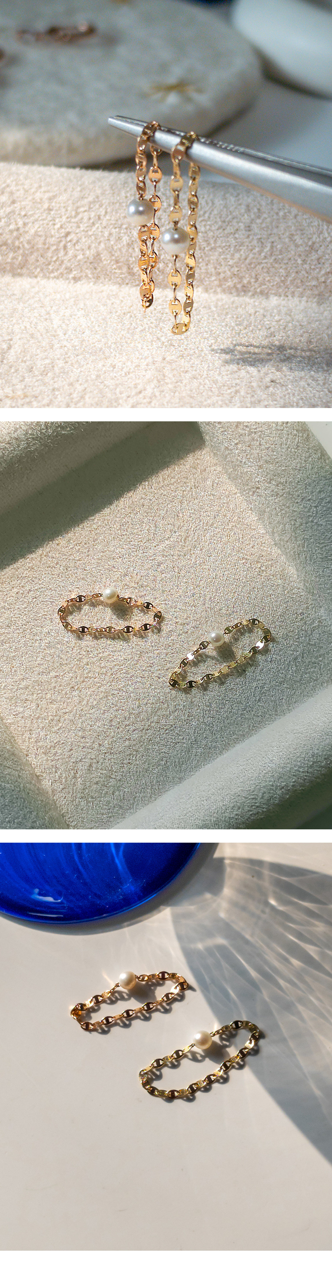 진주에 반짝이는 입체적인 체인과 함께 연출된 반지로